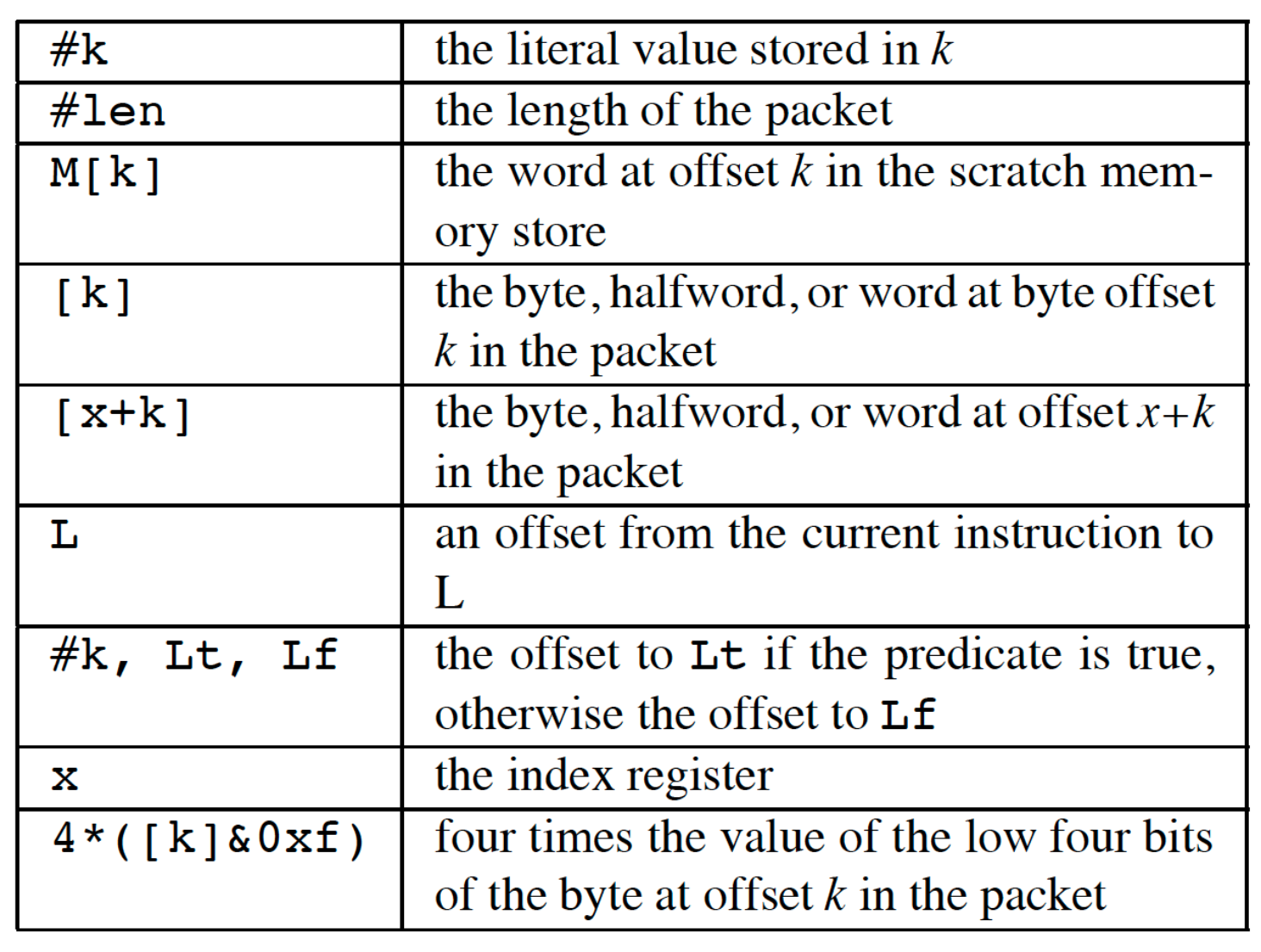 - ld / ldh / ldb 将对对应数据 copy 进 accumulator(32 /16/8),ldx 将值 copy 进 index register;index register 无法用于 packet addressing mode;如果要将包数据 copy 进 x,则必须想用 load 指令将数据 copy 进 accumulator,再通过 tax 指令将其 copy 进 x(txa 指令估计是反方向);