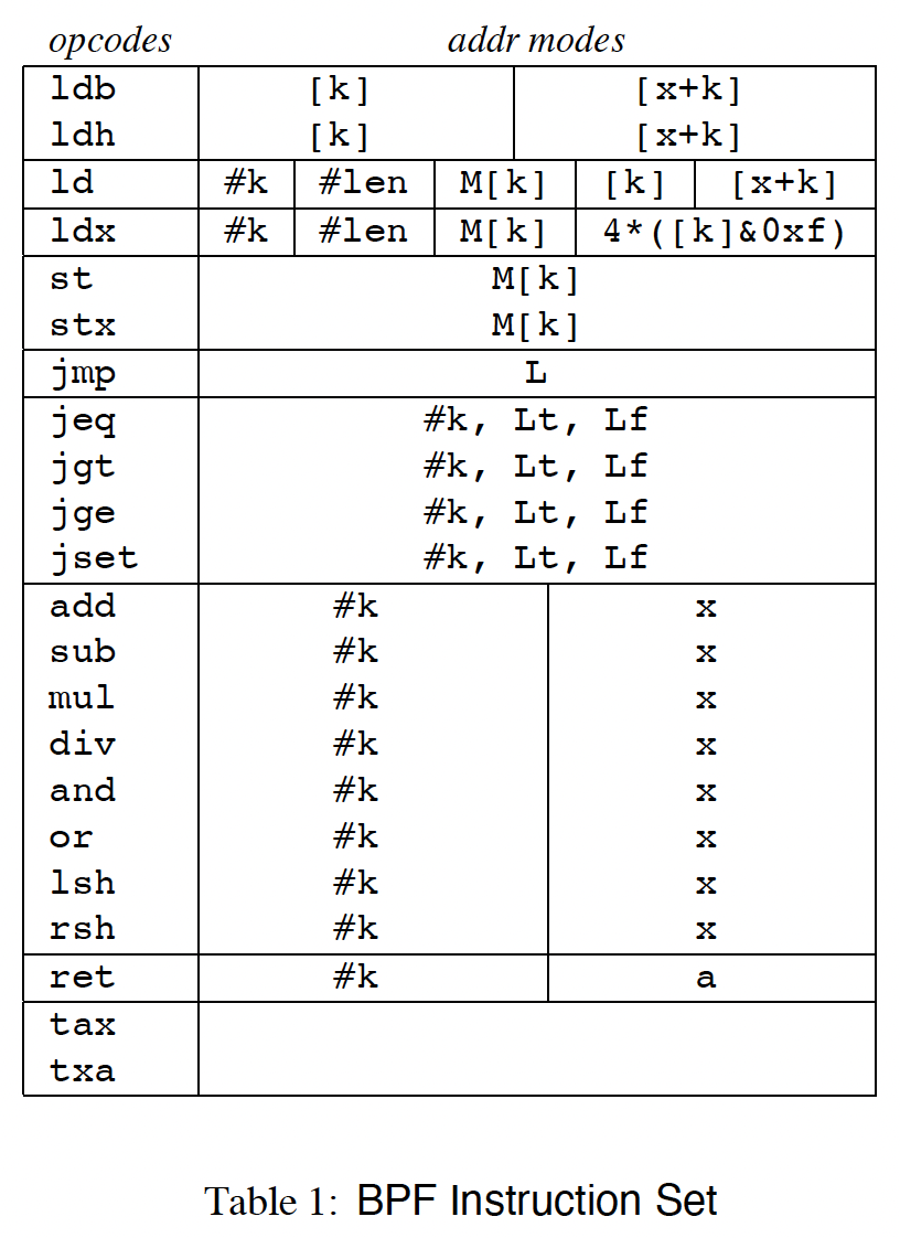 下图则是当时论文设计的完整的 BPF 指令集: