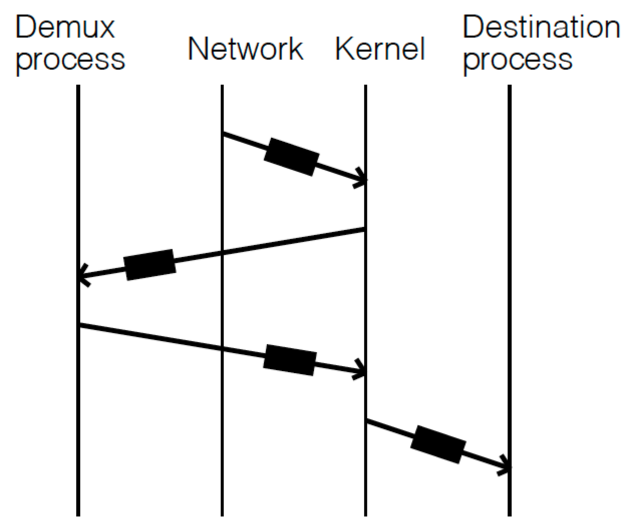 在当年,TCP/IP 协议还未彻底统治网络,用户还是有需求需要自己实现网络协议。假设我们在用户层实现一个网络协议,并运行起一个 Demux 进程:每次网络包到达内核后,由于内核并不知道这个数据包的协议(即不知道需要把这个数据包具体路由到哪个进程),所以内核此时需要通过 Demux 进程来实现这一决策逻辑。下图展示了这一过程: