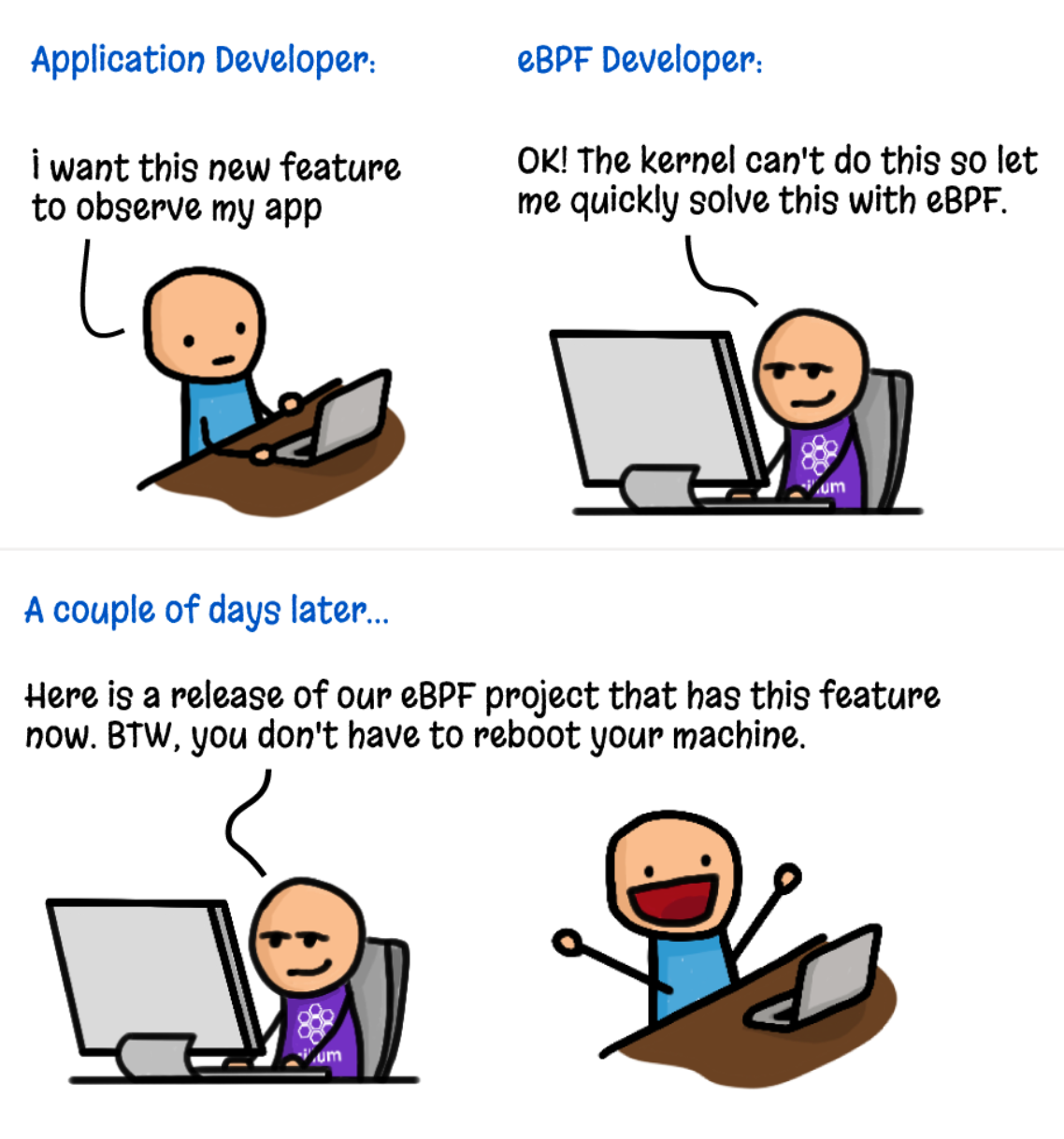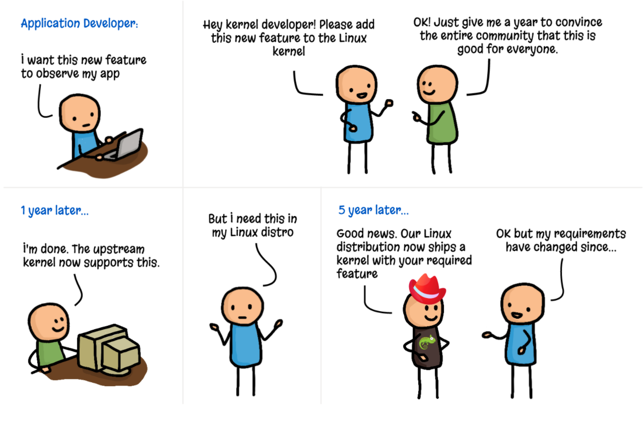 这幅漫画从侧面说明了为什么 Linux 社区想要发明 eBPF 的动机:希望让 Linux 内核可编程。此处的可编程并不是让用户去修改 Linux 内核,而是让用户以一种学习成本极低的方式将自己的逻辑安全地插入内核,从而让用户可以快速给内核定制逻辑。