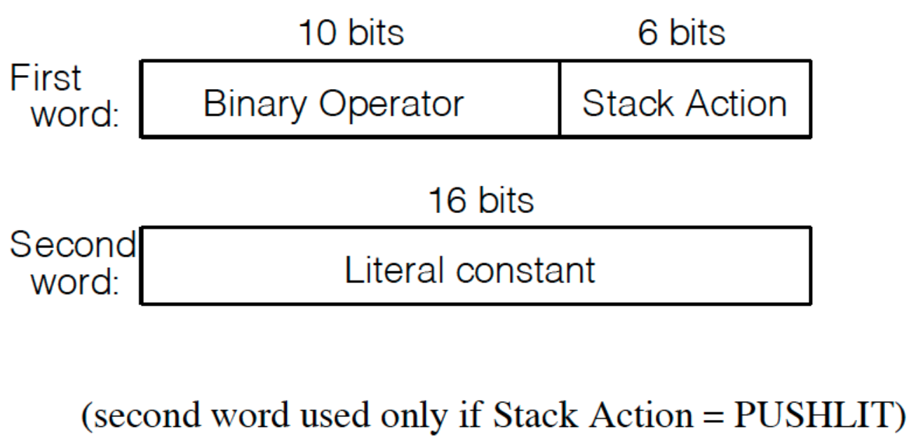 除了 NOP 之外,所有的 binary operator 都会从 stack 上 pop two words,并将相应的结果 push 回 stack。栈顶元素即为 T1,而紧随其后的即为 T2,结果即为 R。对于 ADN / OR / XOR 来说,值非零即为 true。