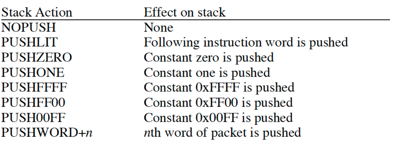 为了在内核中实现这个 Packet Filter,论文设计了一个基于 stack 的虚拟机(顺便提一句,目前很火的 WebAssembly 也是一门基于 stack 的虚拟机),我们可以称之为 CSPF。用户可以用 CSPF 提供的指令集(filter language)进行编程,然后将指令加载入 CSPF 进行执行。从现在的眼光来看,CSPF 提供的 filter language 非常简单:
