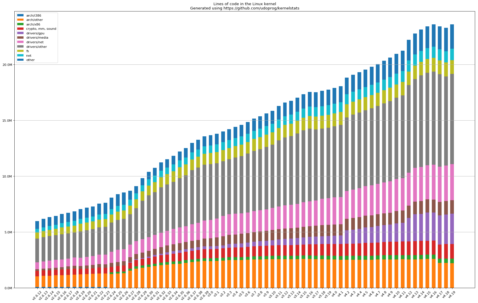 Linux 内核从 1991 年由 Linus Torvalds 在社区发布以来,已历经近 20 年的演化迭代,其代码规模已非个人所能彻底掌握。目前的 Linux 内核代码整体代码规模已经超过了 2700 万行(这还只是 2020 年的统计数据,如今只会更加庞大)。Reddit 上有一张图很好地说明了这一演变过程: