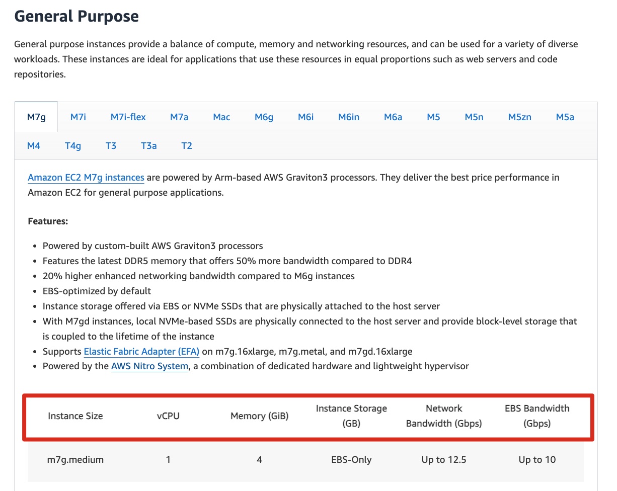 从 AWS 一个典型的 EC2 型号介绍,我们可以提取出以下几个关键参数: