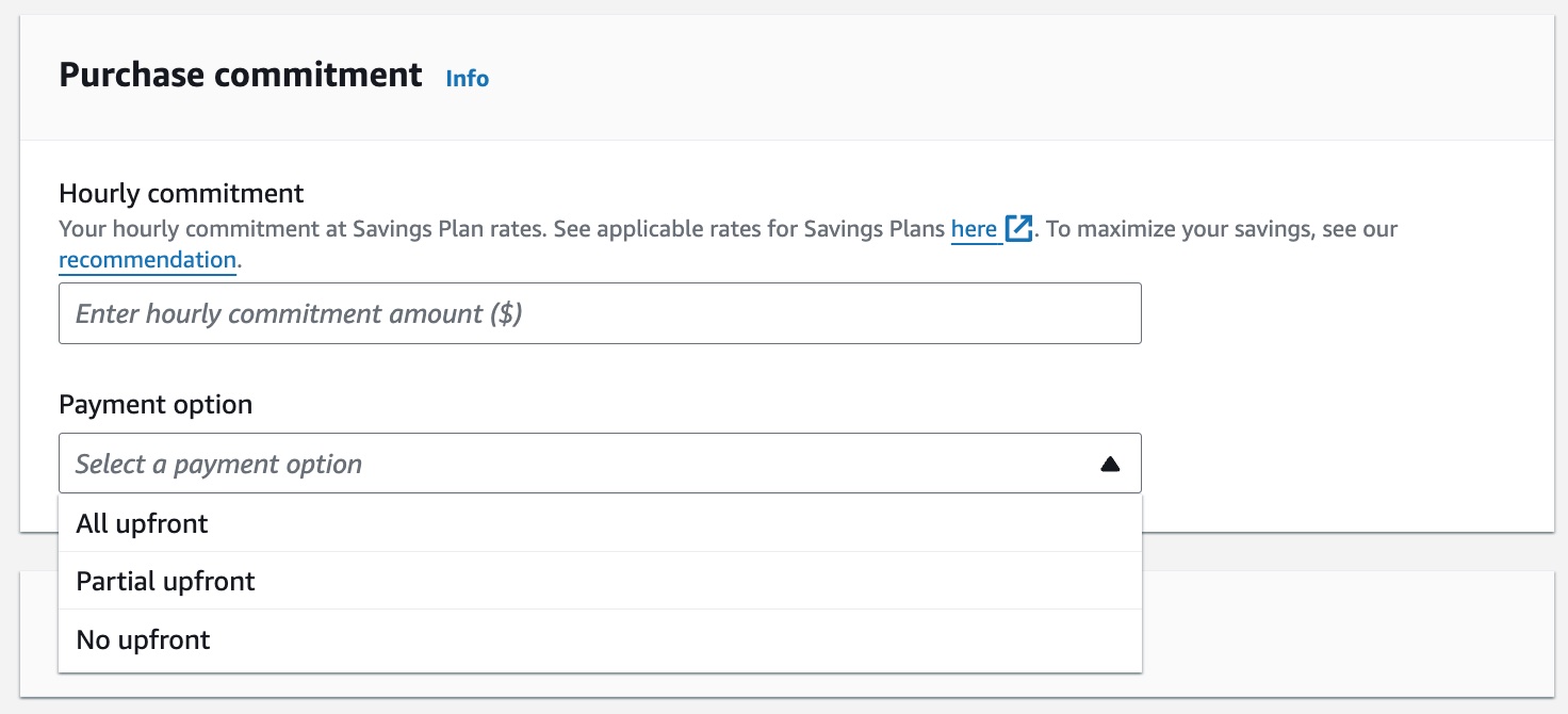 用户需要填写他们承诺每小时使用 EC2 的金额(为了简化,AWS 会有 Recommender 来根据你当前业务情况计算出一个推荐值)。根据付款方式的不同,有 All upfront(全预付)、Partial upfront(部分预付)和 No upfront(无预付)三种类型。当然,预付比例越高,优惠越多。一旦你购买了 Saving Plans,你的基础消费其实就固定了。即使你实际使用量低于承诺使用量,你也必须付给 AWS 承诺的费用。如果你的实际使用量高于承诺使用量,高出的那部分将以 On-Demand 进行额外计费。