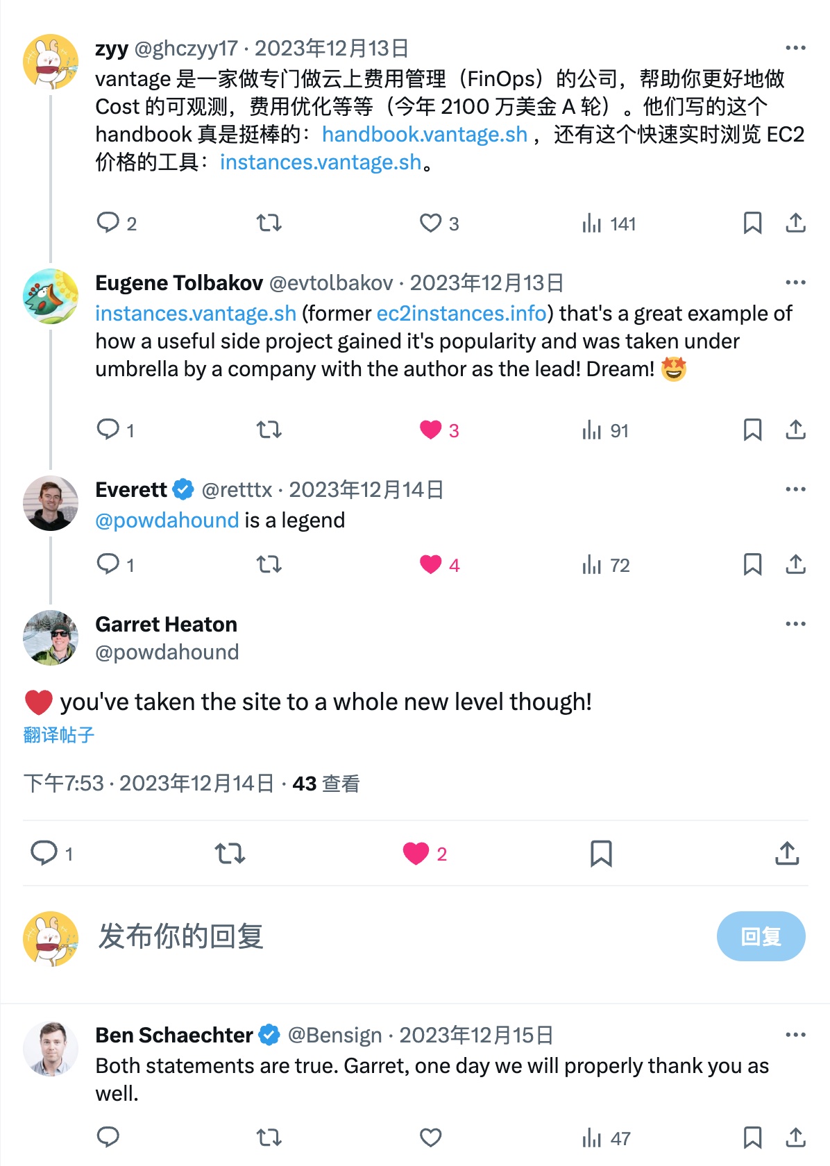 当我在研究各种 EC2 类型的时候,我被 AWS 官方的价格表整得痛苦不已:不仅不直观而且还非常难用。这时候偶然发现了 Vantage 公司的 ec2instances,如获至宝。难能可贵的是,这还是一个开源项目 ec2instances.info。于是我兴奋地发了条 Tweet 表达了我对这个项目的喜爱并得到了一些推友们的评论:
