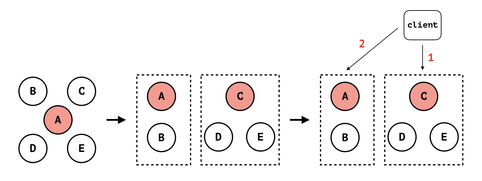 - C、D 和 E 组成的分区在经过一定时间没有收到 leader 的 heartbeat 后,触发 election timeout,此时 C 成为 leader。此时,原来的 5 节点集群因网络分区分割成两个集群:小集群 A 和 B,A 为 leader;大集群 C、D 和 E,C 为 leader;