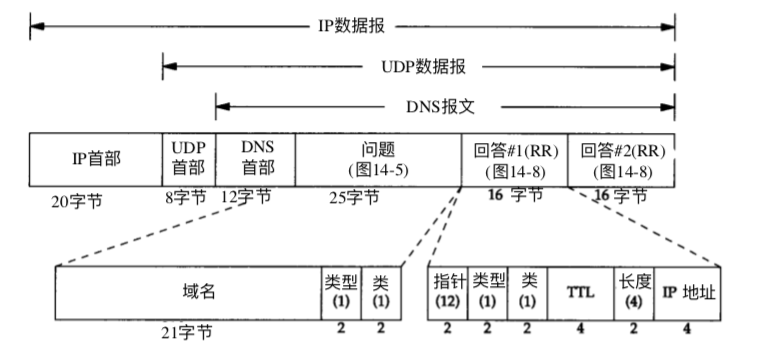 在返回的结果中会有许多重复的域名,因此使用压缩方式。比如上面的例子域名出现了 3 次,使用标签压缩的方式,则 RR 中原本域名的字段变成指针字段;