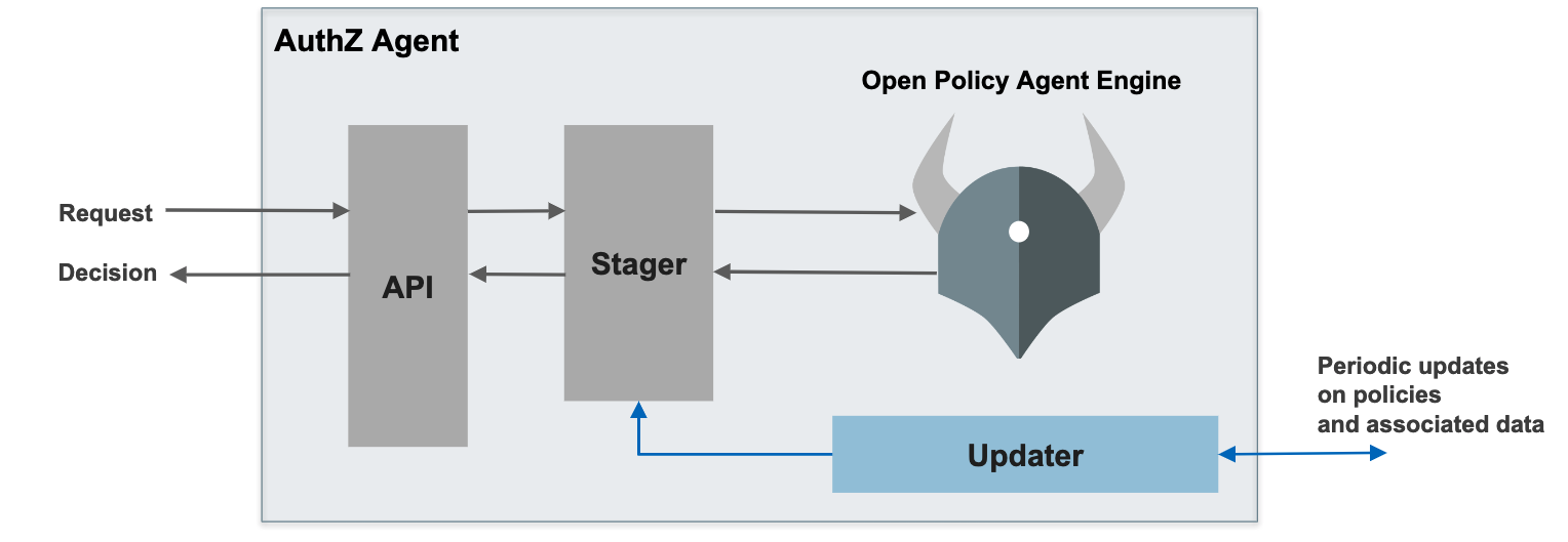 API 层提供 OpenAPI 来供上层业务调用,Stager 承接 API 和 OPA,将具体的请求和 Policy 进行转换并传给 OPA 做具体的策略执行。Updater 则是定期从 Distributor 中更新数据到 Stager 中。