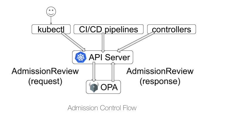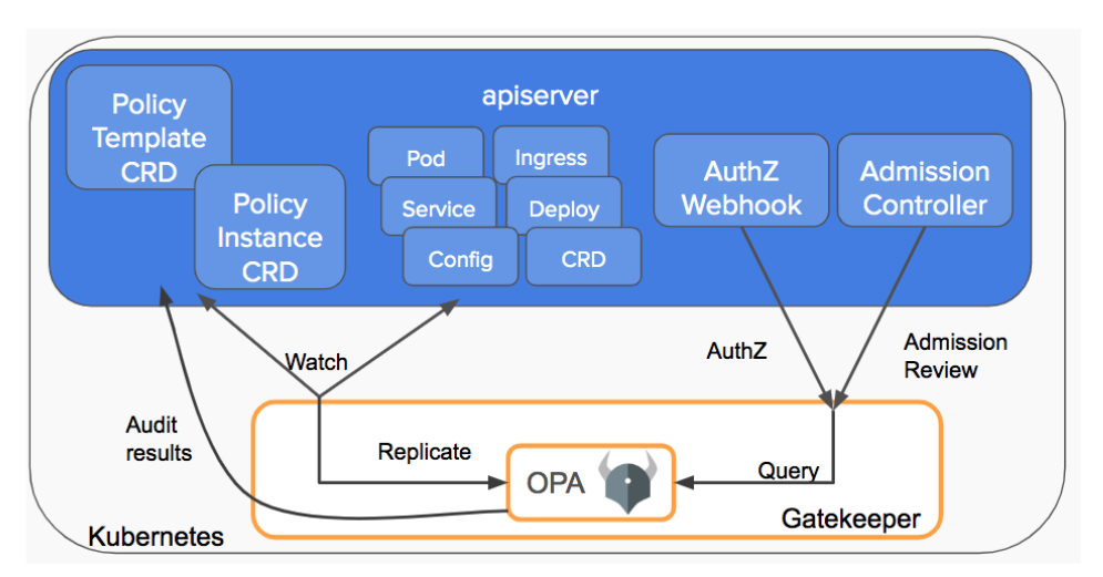Kubernetes 中使用 OPA 需要使用 Kubernetes Admission Control。拿最新发布的 Gatekeeper 项目为例,其主要的架构如下图所示: