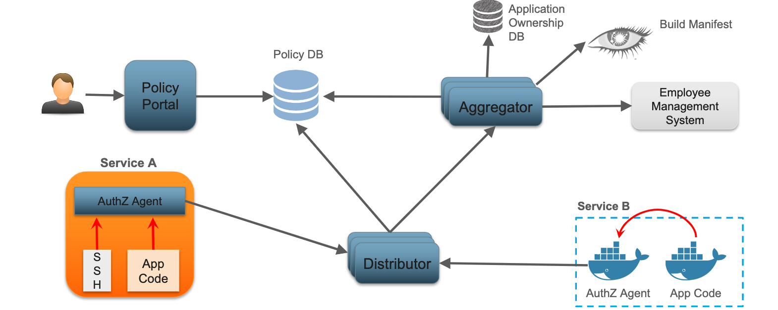 • 上层用户(通常是开发者)通过 Policy Portal 定义 Policy。Policy Portal 是一个 Web UI,帮助用户设置具体的 Policy,并最终将 Policy 持久化到 Policy DB;