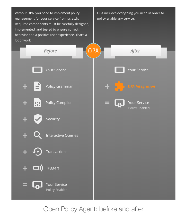 OPA 提出的 Policy Engine 的图景是很美好的,即 Policy As Code。如果能够将 Policy 以一种清晰统一的代码形式管理,那么可以我们至少可以获得以下几个好处: