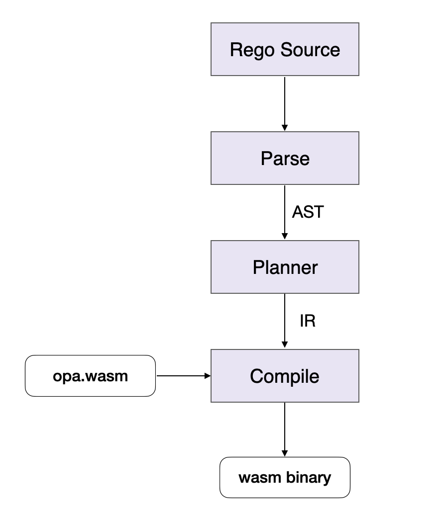 • Compile 环节将 IR 翻译成 wasm bytecode,其中 IR 使用到的底层函数都由 opa.wasm 提供;