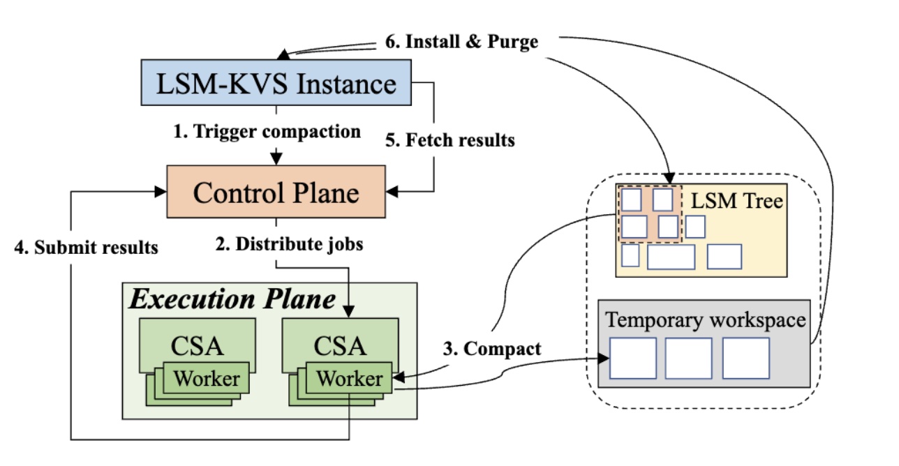 一旦 CSA 接收到了 Compaction 任务,它将启动相应的 thread 来执行这个请求:从 Storage Nodes 上读取目标 SST files 并执行 Compaction,生成的新的 SST files 将被存放在一个临时的 workspace 中;
