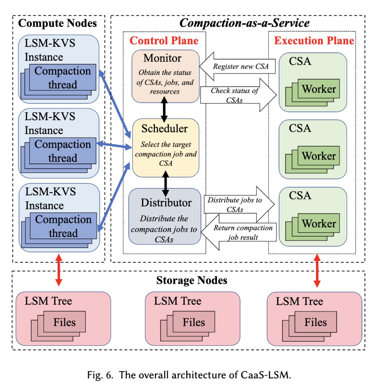 CSA 将周期性收集必要的状态信息(比如 Compaction 的执行状态、资源利用率等)并返回给 Control Plane 和 LSM-KVS Instance 以供资源使用;