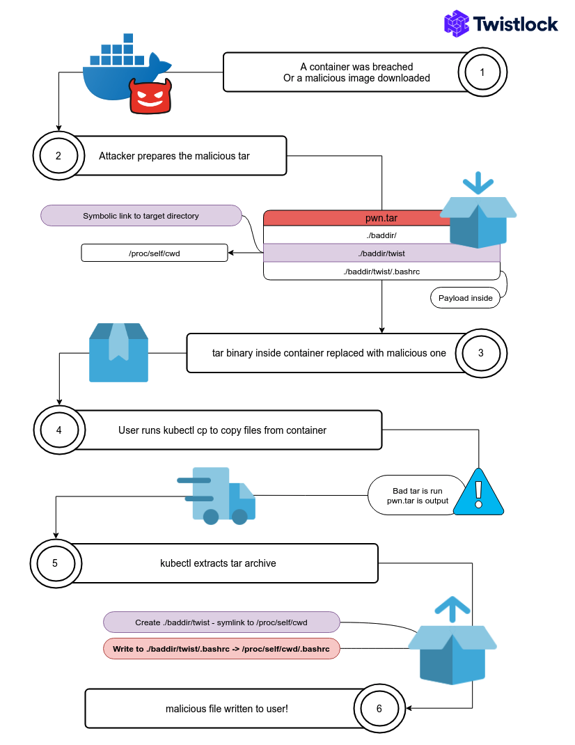 这个 directory traversal 漏洞最早由 Twistlock 的工程师发现。这个问题实际也是通过精心构造一个 tar 包来触发的,也是基于 CVE-2018-1002100 的原理发动攻击。
