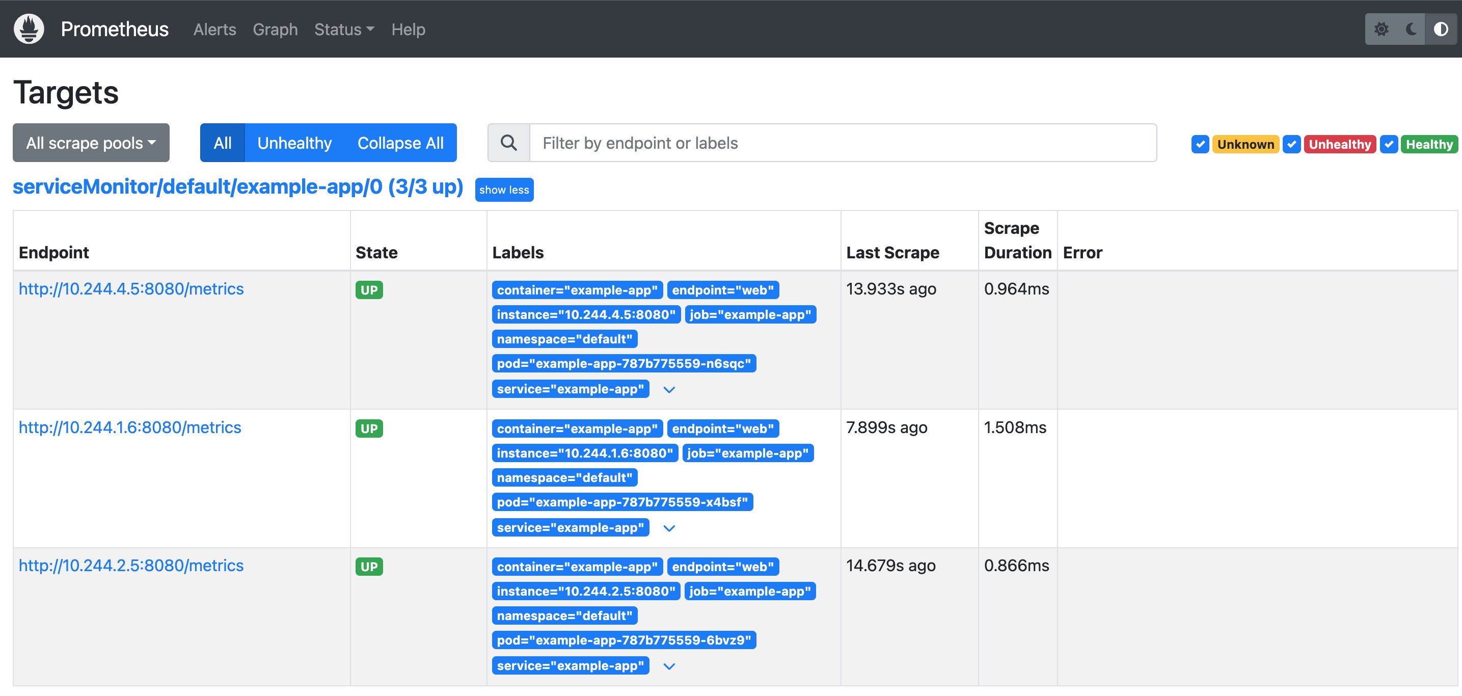 可以观察到出现了名为 serviceMonitor/default/example-app/0 的 Scrape Job。