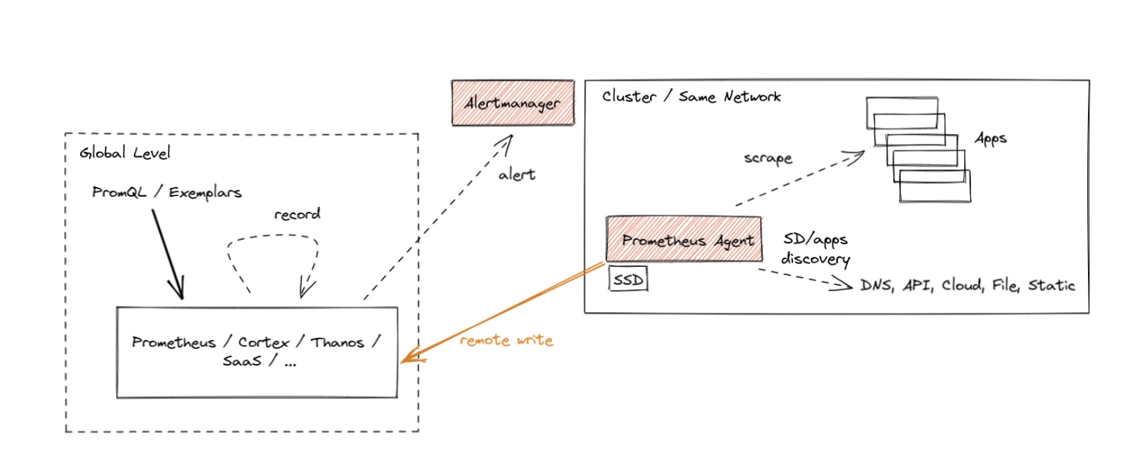 之所以需要 Prometheus Agent,我们其实可以从 Prometheus 的这篇博客一窥究竟。Prometheus Agent 本质上就是将时序数据库能力从 Prometheus 中剥离,并优化 Remote Write 性能,从而让其成为了一个支持 Prometheus 采集语义的高性能 Agent。这样一来,Prometheus Agent 还可以部署在一些资源受限的边缘场景进行数据采集。