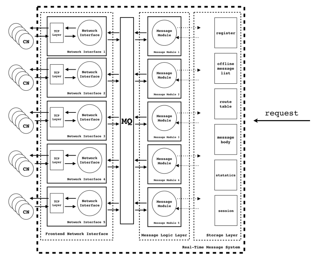 在这个模型中,网络接入层和消息业务逻辑层整体上应该是一个 stateless 的模块,可以较为轻松地做横行扩展。存储层作为一个有状态的模块,想要做到横行扩展是一件很不容易的事情。如果撇开这点来看,至此,这个模型理论上在应对海量用户的场景下应该是有效的。