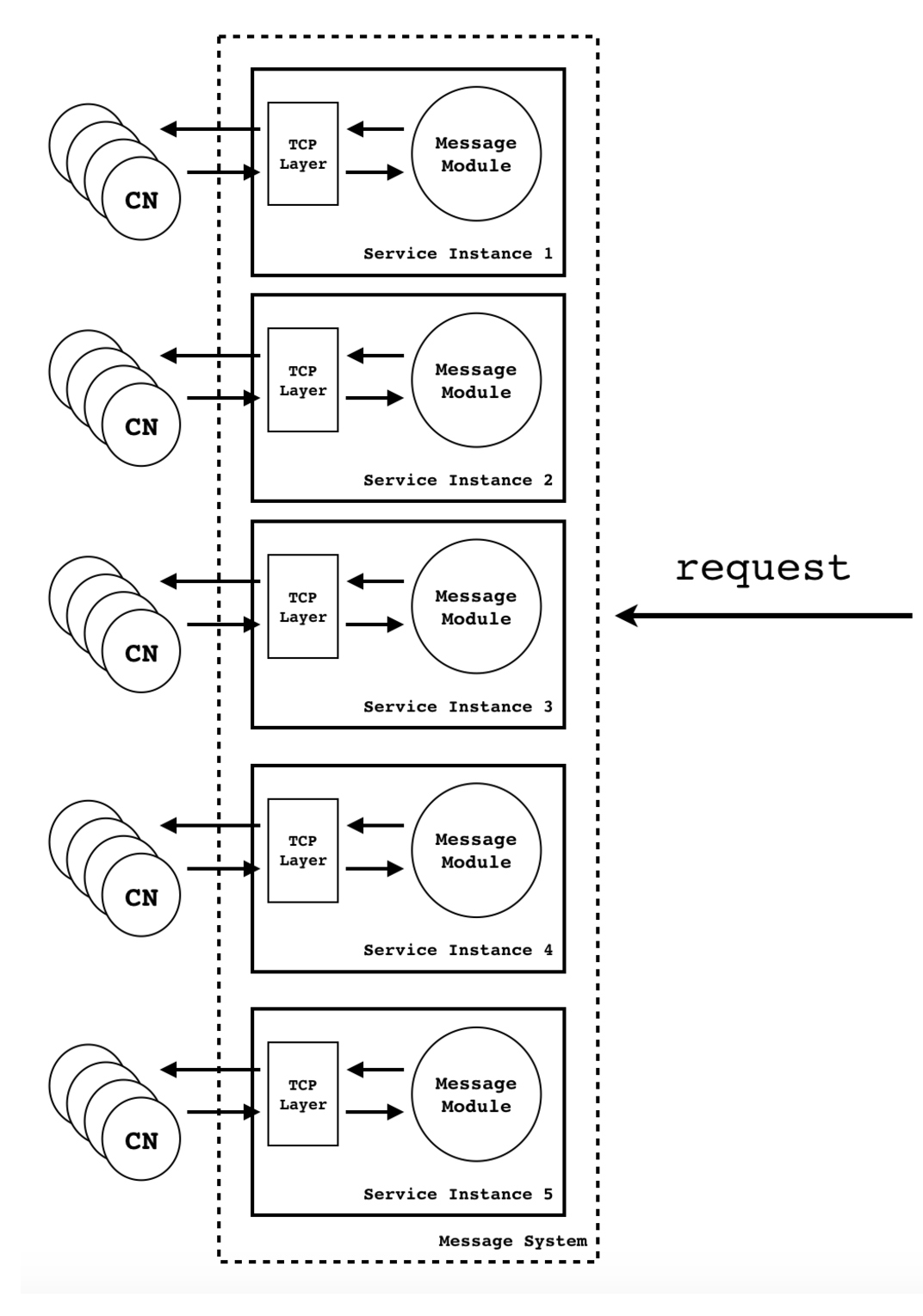 图 1 表示的是单机处理情况。当单机的处理能力,带宽都无法应对客户端数量急剧增加的时候,我们就必须将线路进行分割。而且图 1 只体现了推送的意图(单向),但通信往往是一个双向的概念,综上,我们将 图 1 改成下面的 图 2:
